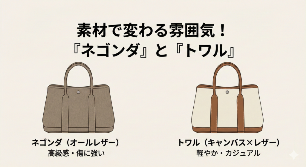 注意点としては、キャンバス部分はレザーに比べて汚れが付きやすく、一度汚れると落としにくい点が挙げられます。しかし、その使い込んだ風合いも含めて「味」として楽しめるのが、ガーデンパーティ本来の魅力でもあります。春夏シーズンや、デニムスタイルが多い方には、トワル素材の軽やかさがぴったりハマるでしょう。