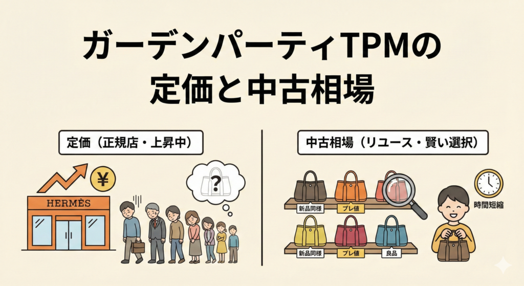 そこで本記事では、エルメス専門店やブランドリユース店で数多くのバッグを見てきた視点から、ガーデンパーティTPMの魅力を徹底的に深掘りします。具体的な収納力の検証から、PMサイズとの比較、素材の選び方、そして昨今の定価事情や賢い購入方法まで、余すことなく解説していきます。