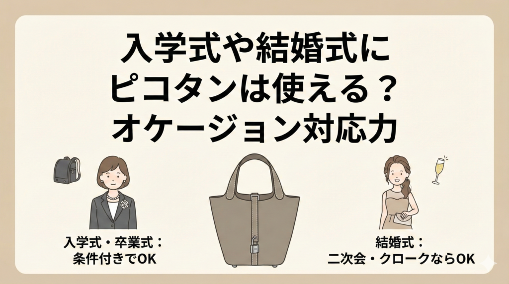 「入学式バッグ」や「結婚式バッグ」のキーワードも多くの検索がありますが、ピコタンはこれらのシーンで使えるのでしょうか?