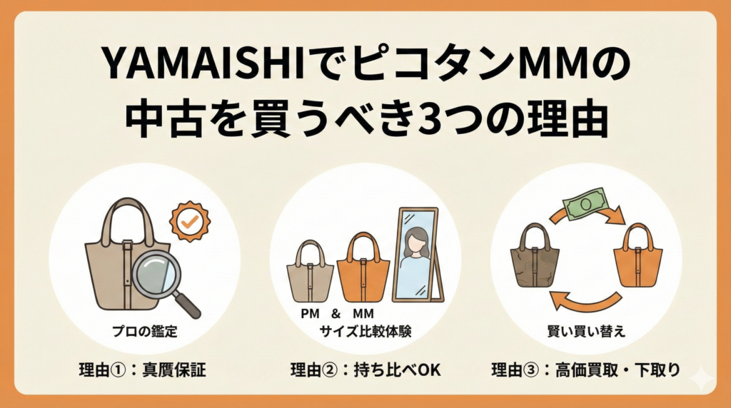 「以前PMを買ったけれど、荷物が増えてMMに買い替えたい」 「MMを持っていたけれど、重く感じてきたのでガーデンパーティーにしたい」 そんな時、YAMAISHIなら「下取り」という選択肢があります。ピコタンはリセールバリューが非常に高いバッグです。当店で購入したバッグはもちろん、他店で購入したエルメスも高価買取いたします。売却と購入をセットにすることで、持ち出しの現金を抑えて新しいバッグを手に入れる「賢い循環」をご提案できます。